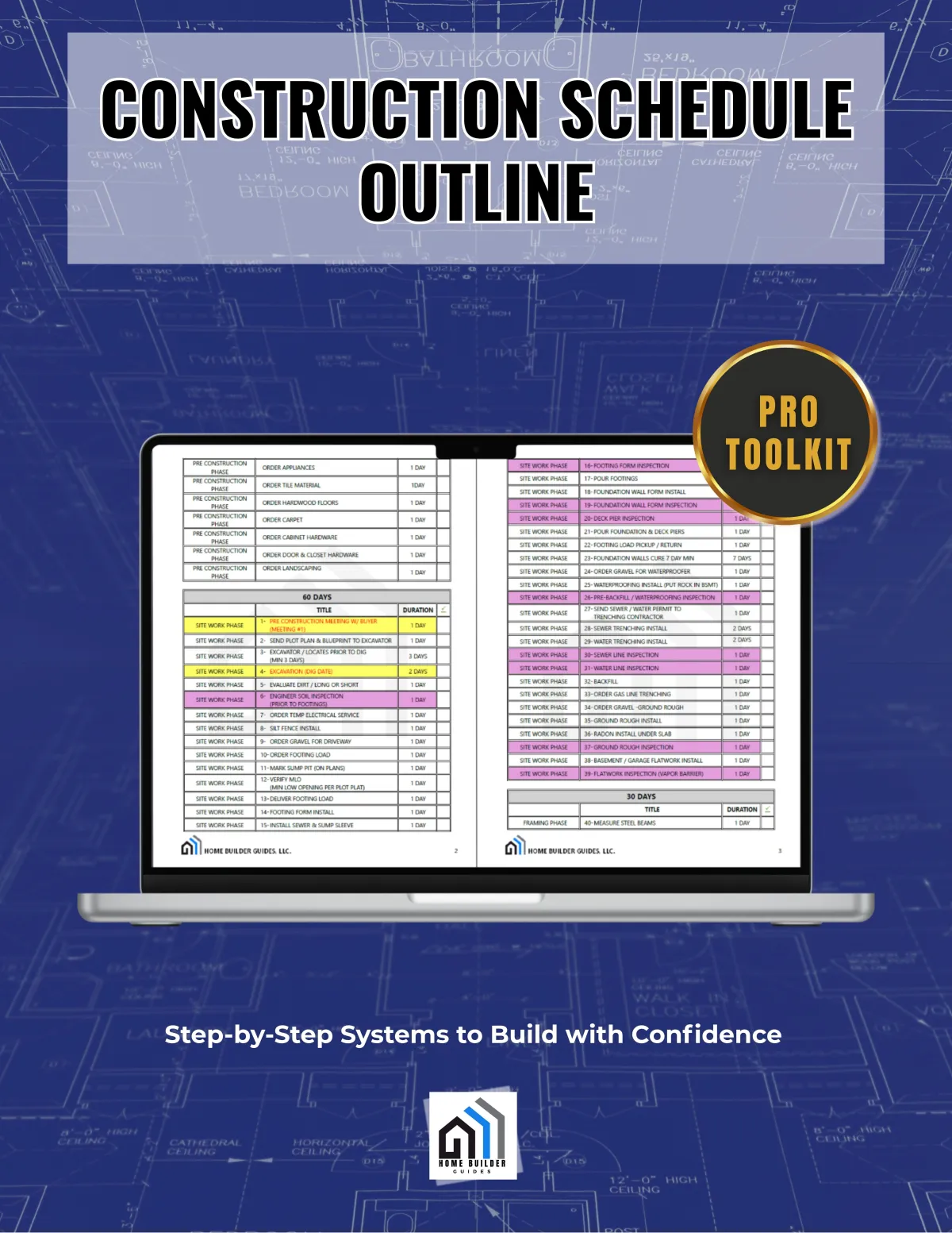 A pre-built 12-page framework that helps organize and visualize the entire construction timeline. This document outlines a 199-step process broken into phases which includes important inspections, buyer walkthroughs, management walkthroughs and key milestones.